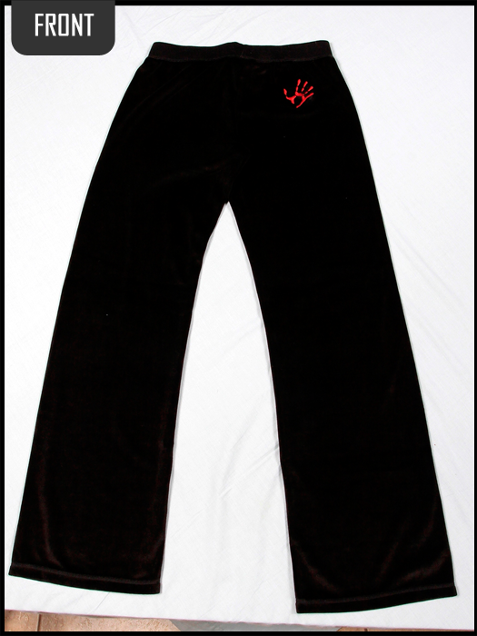 District Threads velor pants w embroidered red hand print on right butt cheek. Pants run true to size.